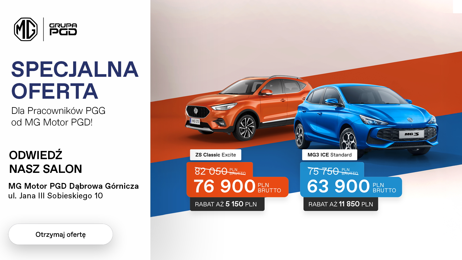 W salonach MG Motor PGD przygotowaliśmy specjalną ofertę dla pracowników Polskiej Grupy Górniczej. Teraz możesz kupić nowoczesny i doskonale wyposażony samochód marki MG w wyjątkowo atrakcyjnej cenie. Sprawdź, które modele objęte są promocją i złap okazję, zanim zniknie!