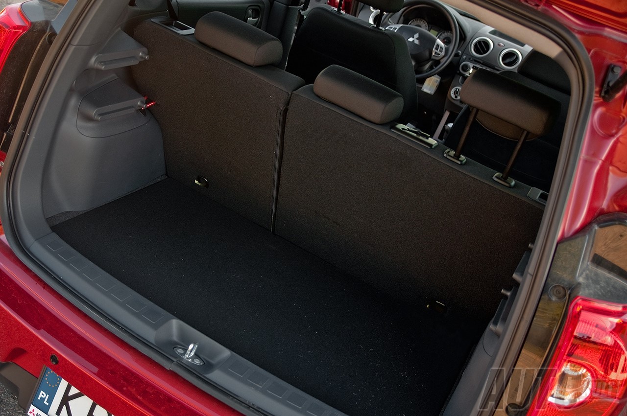 Bagażnik testowanej wersji nie jest za duży – kosztem dostępnego miejsca wewnątrz kabiny. 169 l to nie tak wiele, jednak kiedy złoży się tylne siedziska, dzielone w proporcji 40:60, dostępnego miejsca jest wystarczająco dużo. Poza tym Colt ma ruchomą podłogę, pod którą można włożyć kilka cenniejszych rzeczy i zwiększyć przestrzeń ładunkową do 220 l.