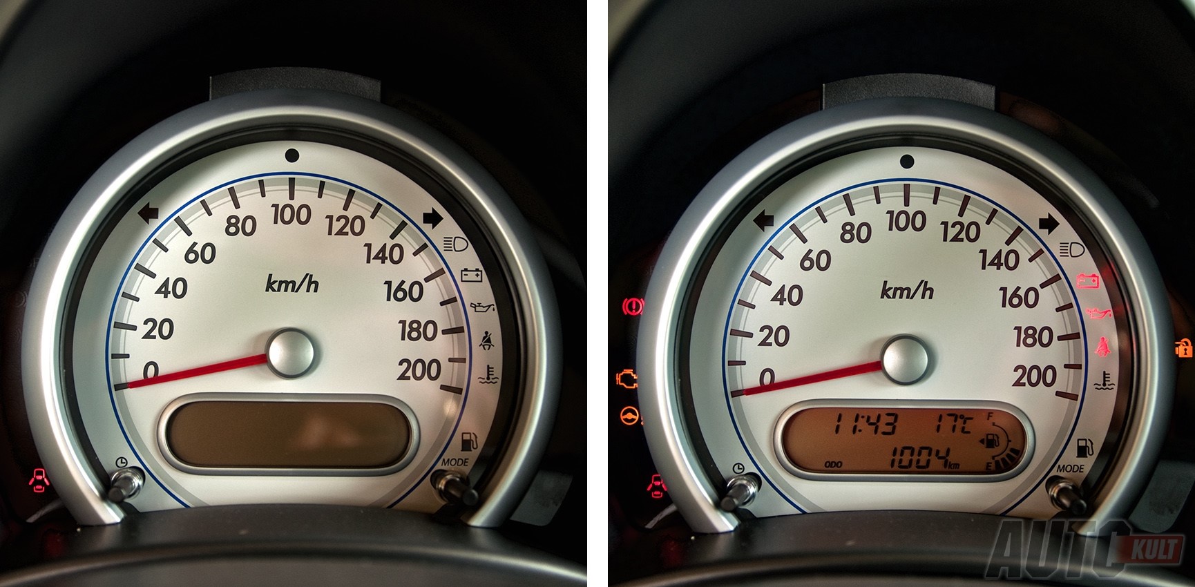 Na pochwałę zasługuje także bardzo duży, czytelny zegar ze wkomponowanym wyświetlaczem LCD w tarczę prędkościomierza. Drobne nieporozumienie stanowi brak obrotomierza w testowanym modelu. Jest on… dostępny jedynie z mocniejszym silnikiem. Taki dodatek montowany jest na wierzchu deski rozdzielczej jako oddzielny wystający zegar, co według mnie wygląda nieco zabawnie, może się podobać lub nie.