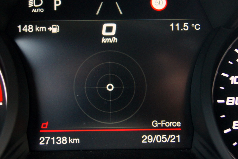 Zmiana wyboru, oprócz chwilowego piktogramu na centralnym wyświetlaczu, powoduje też zmianę podświetlenia na desce rozdzielczej, a dodatkowo zmieniał się zakres widocznych treści, prezentowanych na czterech zrzutach ekranów między zegarami. Są to informacje dotyczące parametrów jazdy dostarczane w czasie rzeczywistym i dotyczą: zużycia paliwa, pokonanej trasy, średnie prędkości przejazdu, wykresu zużycia paliwa w trakcie jazdy w trybach A i N, oraz pomiaru przyspieszenia bocznego (w centralnym punkcie ekranu jest okrąg i poruszająca się czerwona kropka obrazująca siłę bezwładności) w trybie Dynamic.