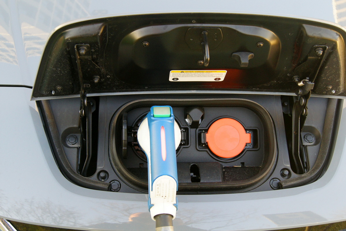 Aby naładować baterię trakcyjną należy nacisnąć przycisk znajdujący się z lewej strony pod kierownicą, co zwolni blokadę klapki z przodu pojazdu i pozwoli odsłonić gniazda podłączenia prądu.