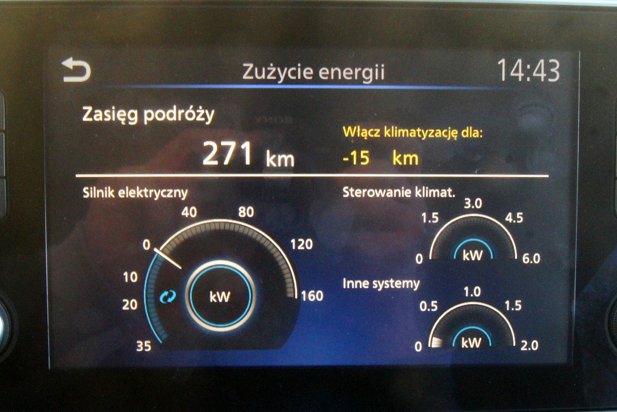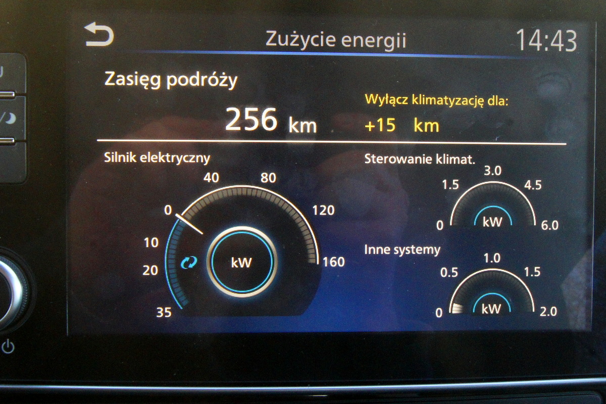 Oczywiście jest to kosztem zasięgu. Jak sprawdzałem podczas jazdy rankiem przy temperaturze „-2” całkowite wyłączenie ogrzewania, to zwiększenie zasięgu o 20 km. Także włączenie przycisku ECO (ograniczona zostaje moc silnika, nadmuch przechodzi w styl eco) zwiększa zasięg o 17 km, a dynamika samochodu jest ograniczona.